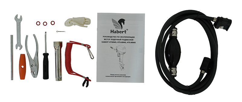 Руководство, ключ свечной, чека,аварийный шнур, помпа, прокладки редуктора, бак топливный